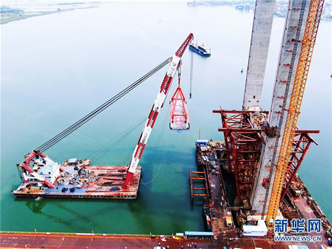 這是5月29日拍攝的廣東湛江調(diào)順跨海大橋施工現(xiàn)場(無人機照片)。 新華社記者 盧燁 攝