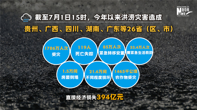 今年汛情帶來的破壞力有多強(qiáng)?張家團(tuán)告訴記者,截至7月1日15時(shí),今年以來洪澇災(zāi)害造成貴州、廣西、四川、湖南、廣東等26?。▍^(qū)、市)1786萬人次受災(zāi),119人死亡失蹤,85萬人次緊急轉(zhuǎn)移安置,33.4萬人次需緊急生活救助;1.5萬間房屋倒塌,21.6萬間不同程度損壞;農(nóng)作物受災(zāi)面積1465千公頃,其中絕收150千公頃;直接經(jīng)濟(jì)損失394億元。