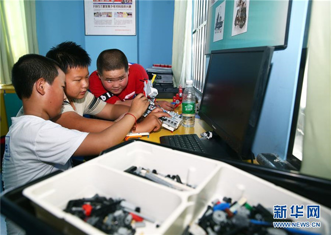 7月22日,學(xué)生在石嘴山市大武口區(qū)青少年學(xué)生校外活動中心活動室內(nèi)一起學(xué)習(xí)組裝機(jī)器人。新華社記者 賈浩成 攝
