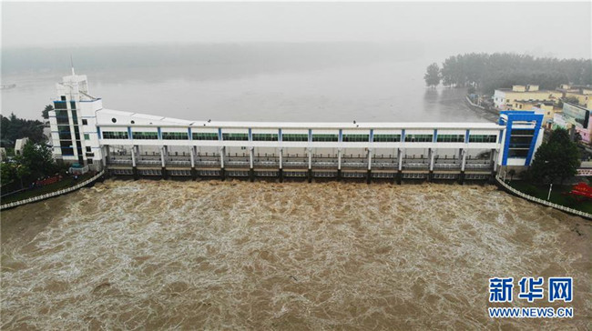 7月20日,淮河王家壩閘開閘泄洪(無人機(jī)照片)。 新華社記者 黃博涵 攝