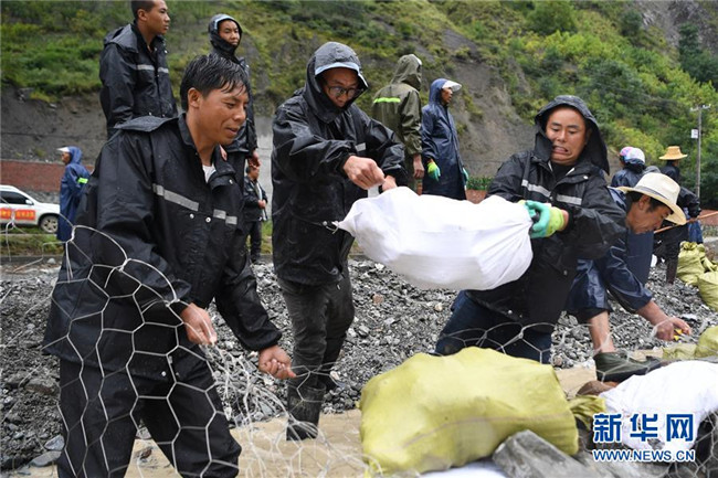 8月23日,舟曲縣曲告納鎮(zhèn)拉莫蓋托村村民在鐵壩河沿岸水毀的道路上搶險(xiǎn)自救。 新華社記者 陳斌 攝