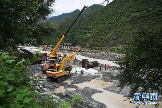 8月23日,搶險(xiǎn)人員在舟曲縣曲告納鎮(zhèn)境內(nèi)被沖毀的鐵壩河1號(hào)橋旁開(kāi)展道路搶通作業(yè)。 新華社記者 郎兵兵 攝