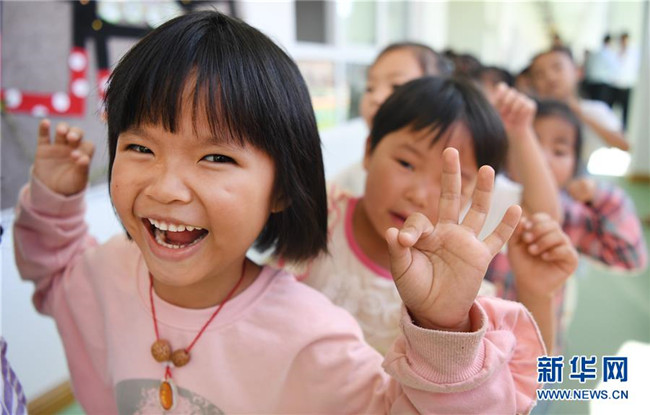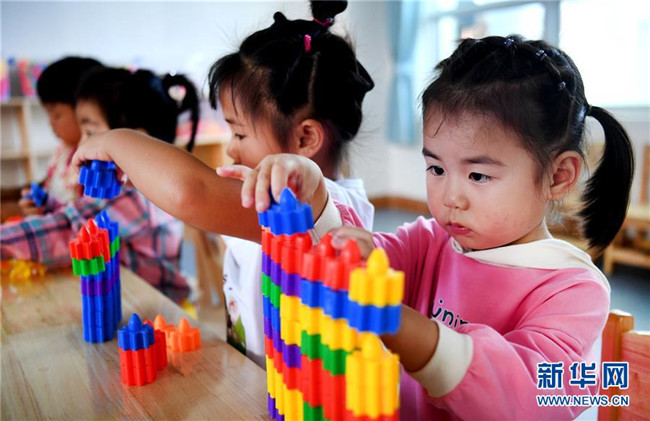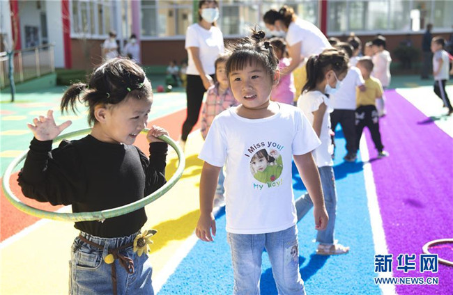 8月25日,在新落成的靈口鎮(zhèn)中心幼兒園里,即將入園的孩子們?cè)谧鲇螒?。新華社記者陶明攝
