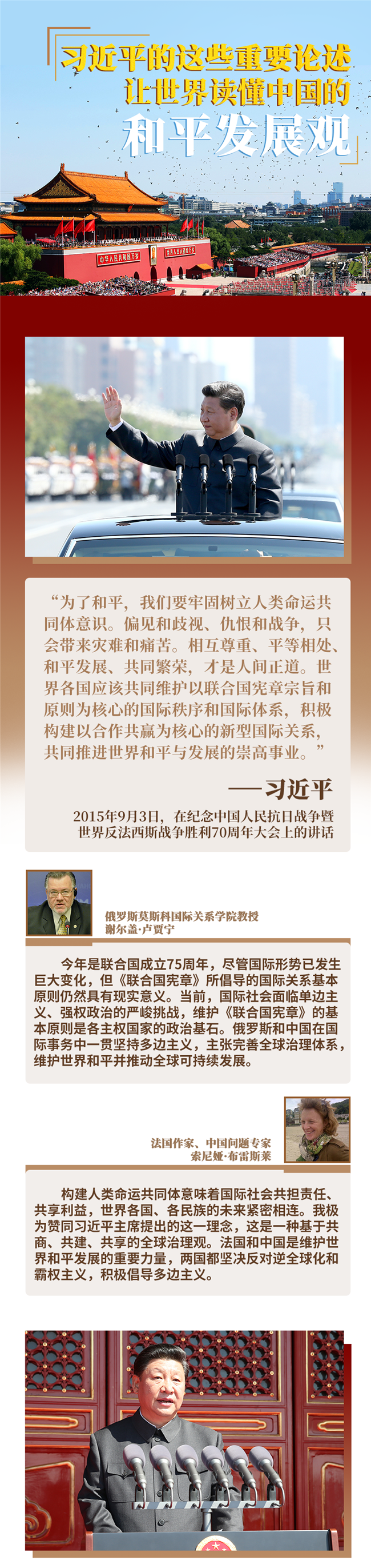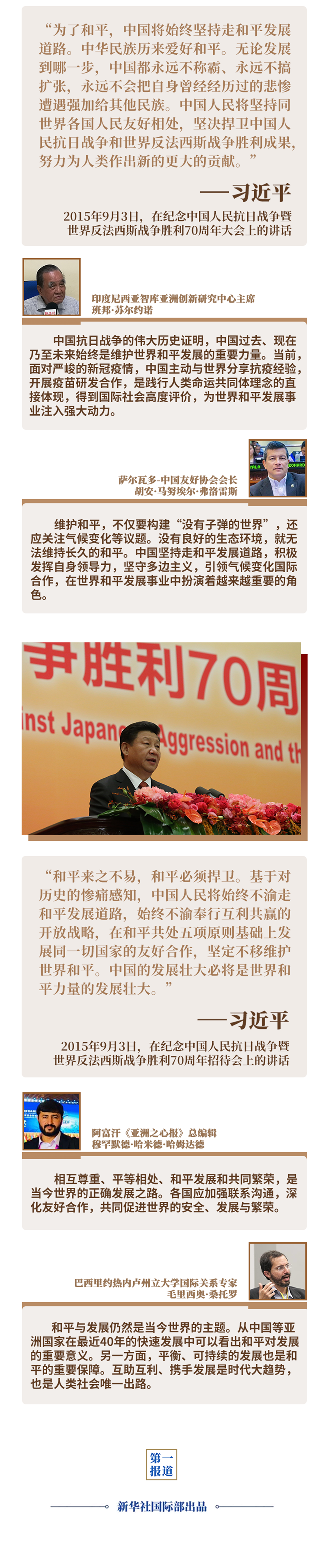 當(dāng)今世界仍不太平,新冠疫情推動百年變局加速變化,進(jìn)入動蕩變革期的世界亟需明確前行方向。此時,重溫5年前習(xí)近平主席紀(jì)念中國人民抗日戰(zhàn)爭暨世界反法西斯戰(zhàn)爭勝利70周年重要講話中關(guān)于和平發(fā)展的重要論述,尤其具有現(xiàn)實意義——