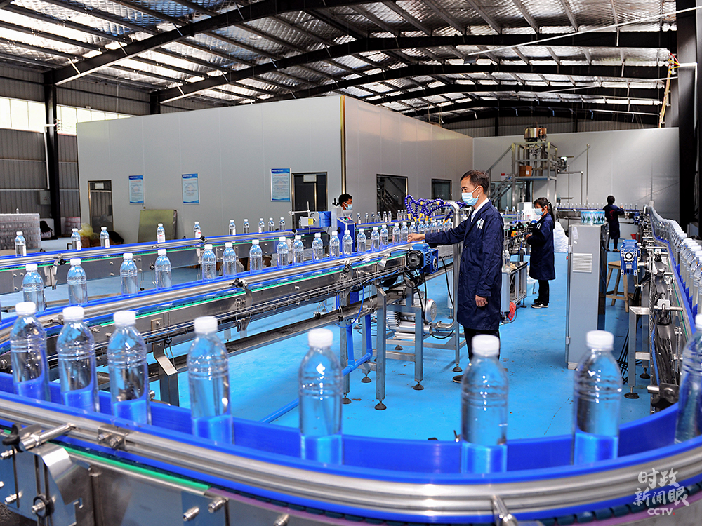 △湖南邵陽市桐山鄉(xiāng)椒林村充分利用當(dāng)?shù)厣饺Y源,加工生產(chǎn)瓶裝水。