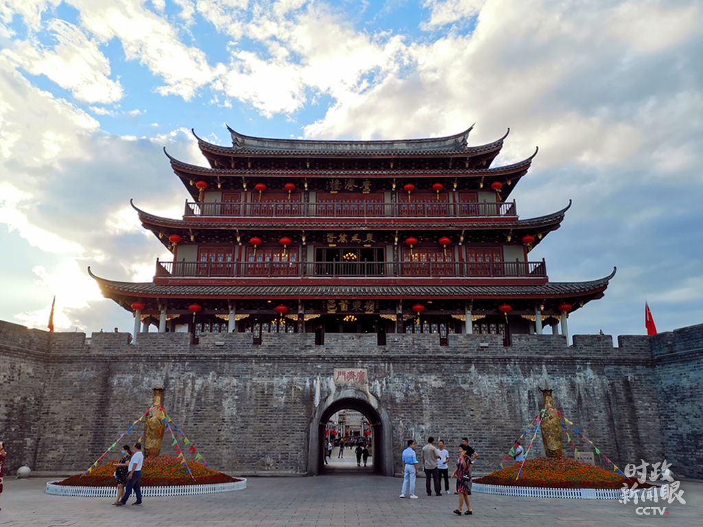△修復(fù)后的廣濟(jì)門城樓高24.5米,城樓上的“東為萬春”和“嶺東首邑”分別由國(guó)際漢學(xué)大師饒宗頤、書法家劉炳森題寫。(總臺(tái)央視記者楊立峰拍攝)