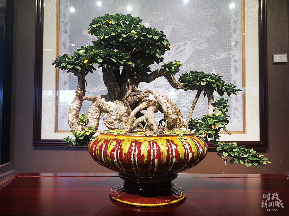 △楓溪瓷燒制技藝是國(guó)家級(jí)非物質(zhì)文化遺產(chǎn)之一,這是作品《榕樹盆景》。(總臺(tái)央視記者張曉鵬拍攝)