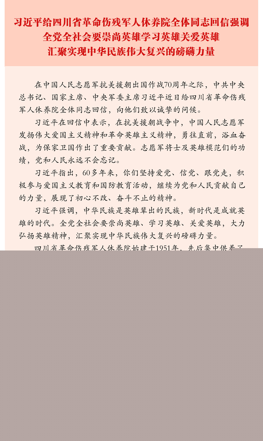 在中國人民志愿軍抗美援朝出國作戰(zhàn)70周年之際,中共中央總書記、國家主席、中央軍委主席習(xí)近平近日給四川省革命傷殘軍人休養(yǎng)院全體同志回信,向他們致以誠摯的問候。