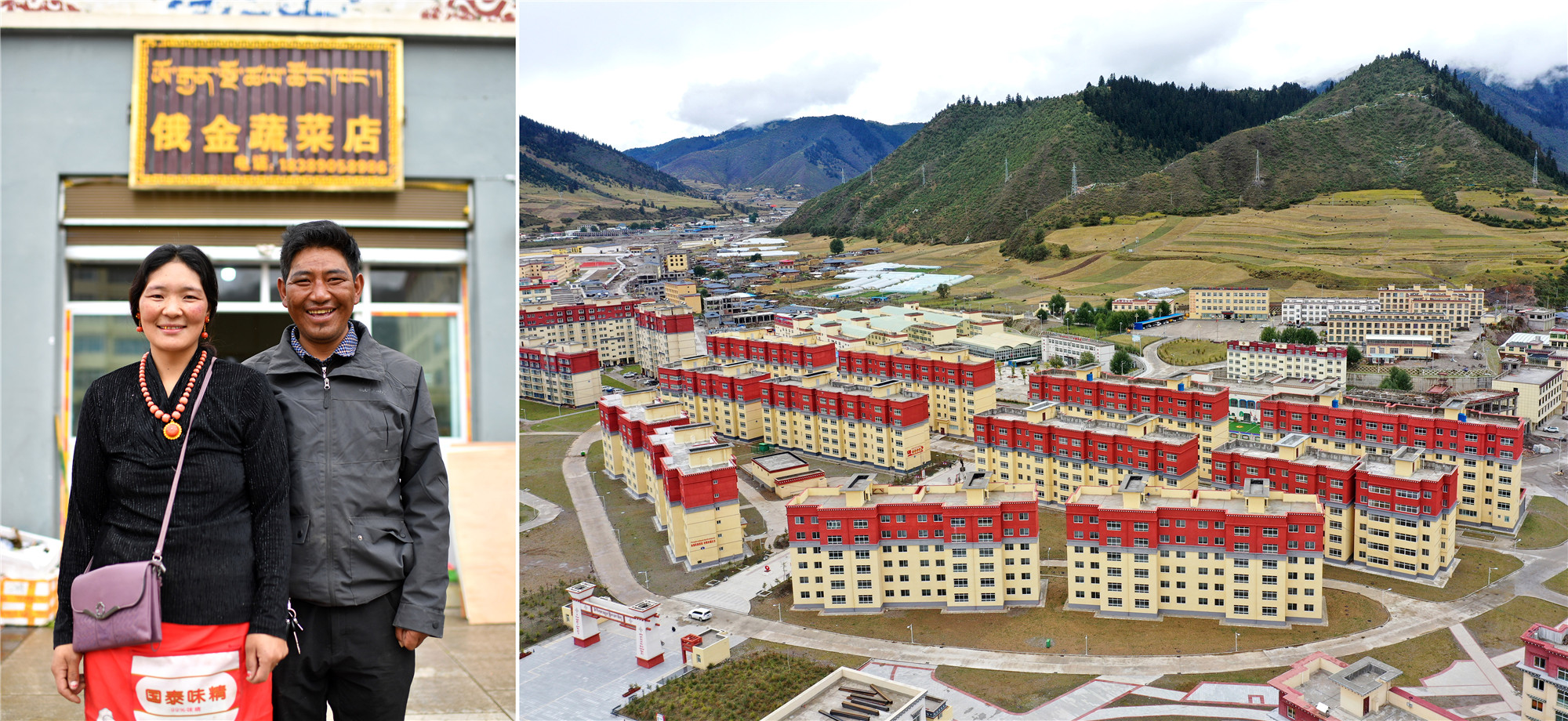2020年9月22日拍攝的拼版照片:左圖為西藏自治區(qū)昌都市類烏齊縣長毛嶺鄉(xiāng)達(dá)雄村村民俄金(右)和妻子阿丁在安置點(diǎn)俄金蔬菜店前;右圖為類烏齊縣桑多扶貧開發(fā)區(qū)易地扶貧搬遷安置點(diǎn)一角(無人機(jī)照片)。新華社記者 詹彥 攝