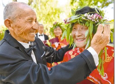 浙江省湖州市長興縣夾浦鎮(zhèn)長平村“歲月述金婚”活動現(xiàn)場,楊水良(左)為妻子楊富元佩戴愛的花環(huán)。 |