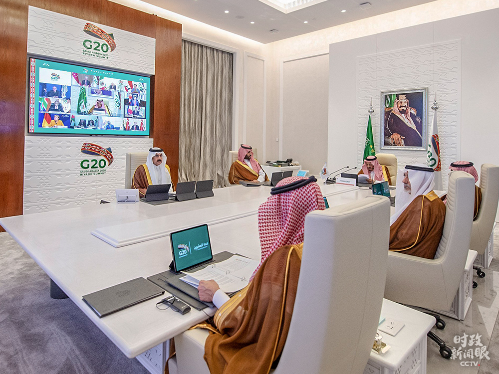 △沙特國王薩勒曼主持G20領(lǐng)導(dǎo)人第15次峰會第一階段會議。(來源于G20官方社交媒體)