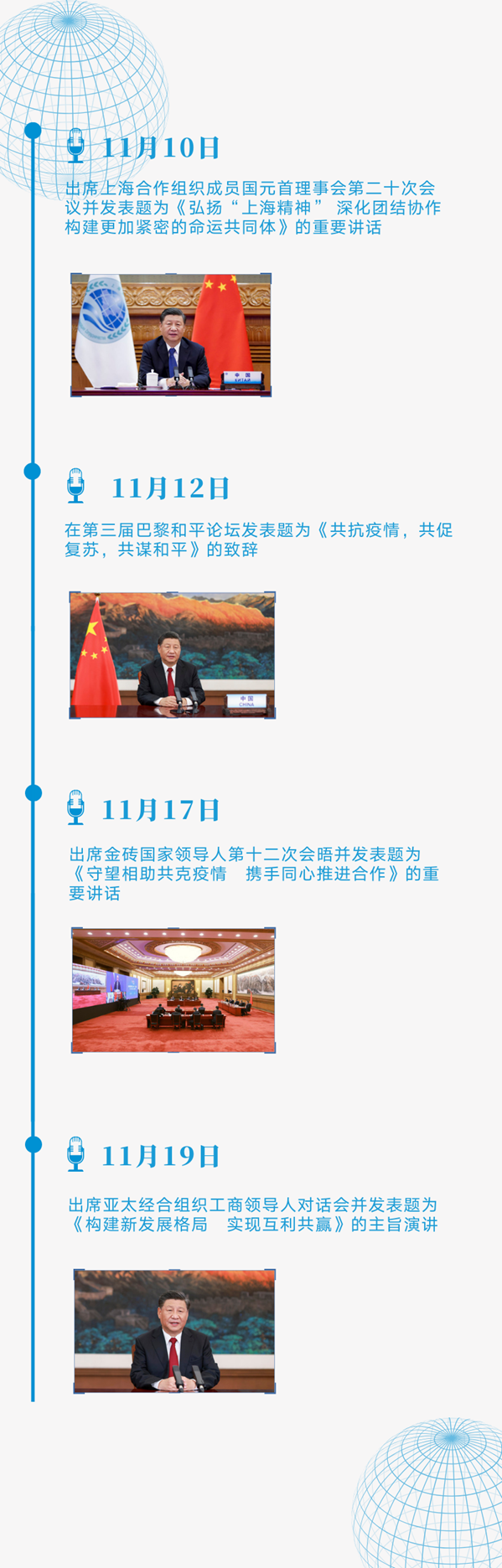 11月10日至22日,不到兩周時(shí)間,習(xí)主席以視頻方式出席4場(chǎng)多邊會(huì)議、一場(chǎng)國(guó)際論壇,發(fā)表8場(chǎng)重要講話(huà)、主旨演講和致辭,外交日程異常密集。