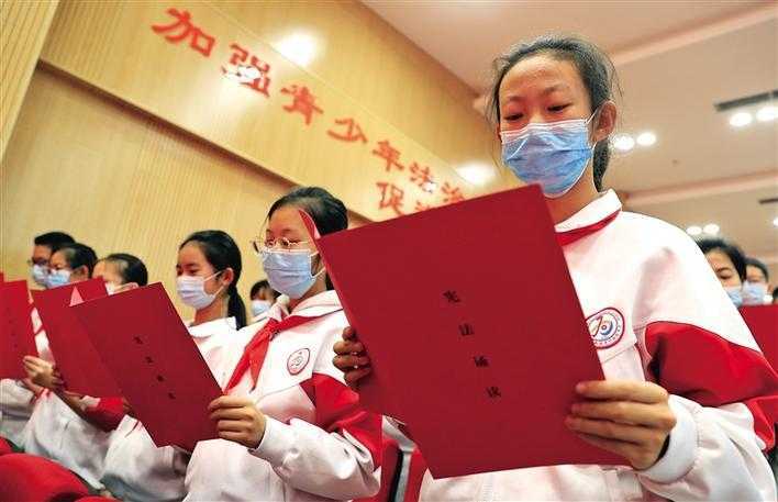 11月30日,陜西省2020年“憲法宣傳周”啟動(dòng)儀式在西安舉行。全省13個(gè)市(區(qū))107個(gè)縣(區(qū))統(tǒng)一啟動(dòng)實(shí)施。這是西安高新區(qū)第五小學(xué)探花嶺校區(qū)學(xué)生正在誦讀憲法。 記者 安濤 攝