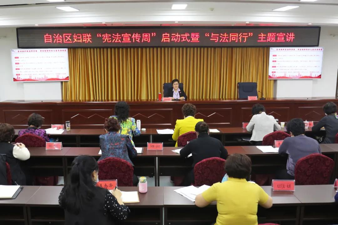 今年12月4日是第七個國家憲法日,也是我國第三個“憲法宣傳周”。今年的活動主題為“深入學(xué)習(xí)宣傳習(xí)近平法治思想,大力弘揚憲法精神”。為全面貫徹落實黨的十九屆五中全會精神和第三次中央新疆工作座談會精神,充分發(fā)揮婦聯(lián)組織的優(yōu)勢和作用,推動憲法學(xué)習(xí)宣傳走入日常生活、走入干部群眾,11月30日, 自治區(qū)婦聯(lián)按照自治區(qū)黨委全面依法治疆委員會辦公室要求,舉辦了“憲法宣傳周”啟動式暨“與法同行”主題宣講活動。