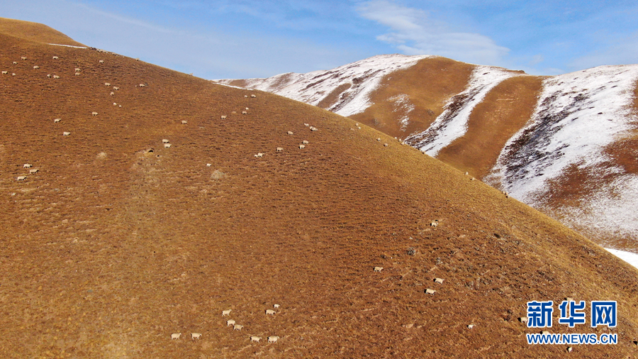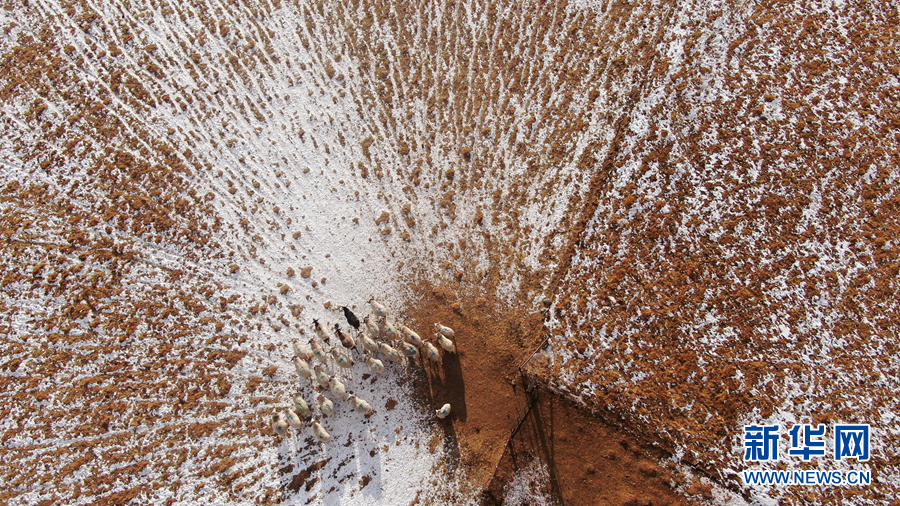 12月6日,羊群在雪后的阿柔草原上活動(無人機照片)。新華社記者 張宏祥 攝