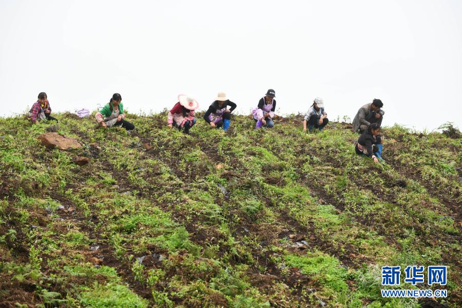 農(nóng)民在貴州省普安縣地瓜鎮(zhèn)屯上村的“扶貧茶園”里給茶苗除草(2019年7月7日攝)。當?shù)氐牟鑸@栽種有浙江安吉黃杜村捐贈的白茶苗。新華社記者 楊文斌 攝
