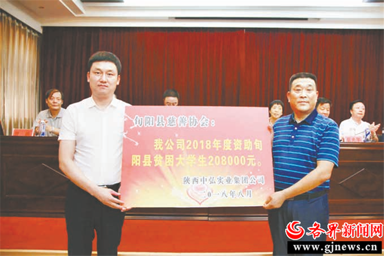 2018年8月,省政協(xié)委員、陜西中弘實業(yè)集團(tuán)有限公司董事長徐浩向旬陽縣貧困大學(xué)生捐贈善款。