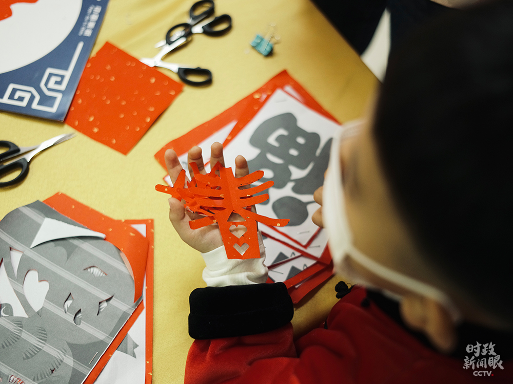 △孩子們在社區(qū)活動室練習(xí)剪紙。(總臺央視記者王哈男拍攝)