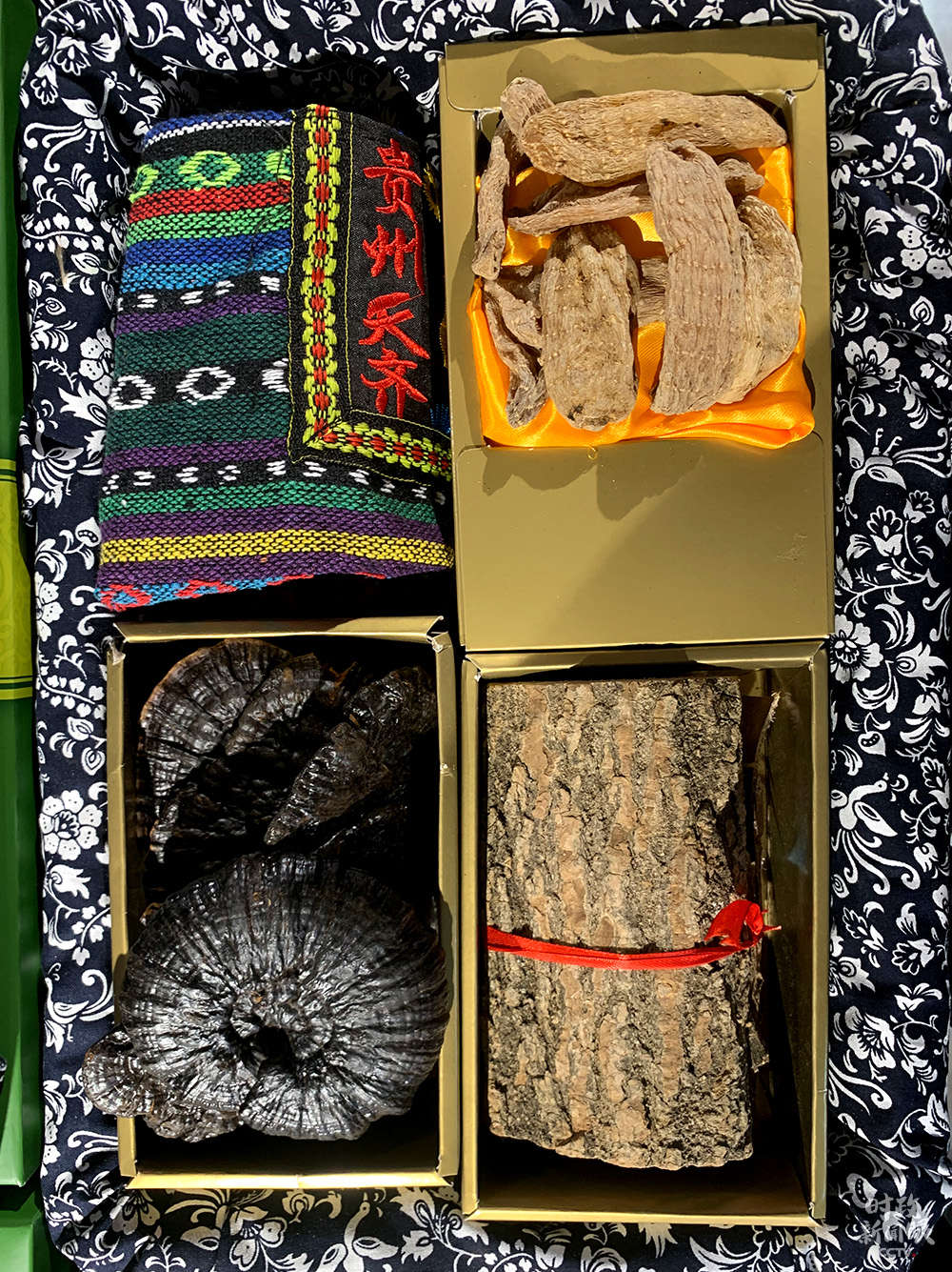 △貴州三寶,右上為天麻,下方分別是靈芝、杜仲。(總臺央視記者王鵬飛拍攝)