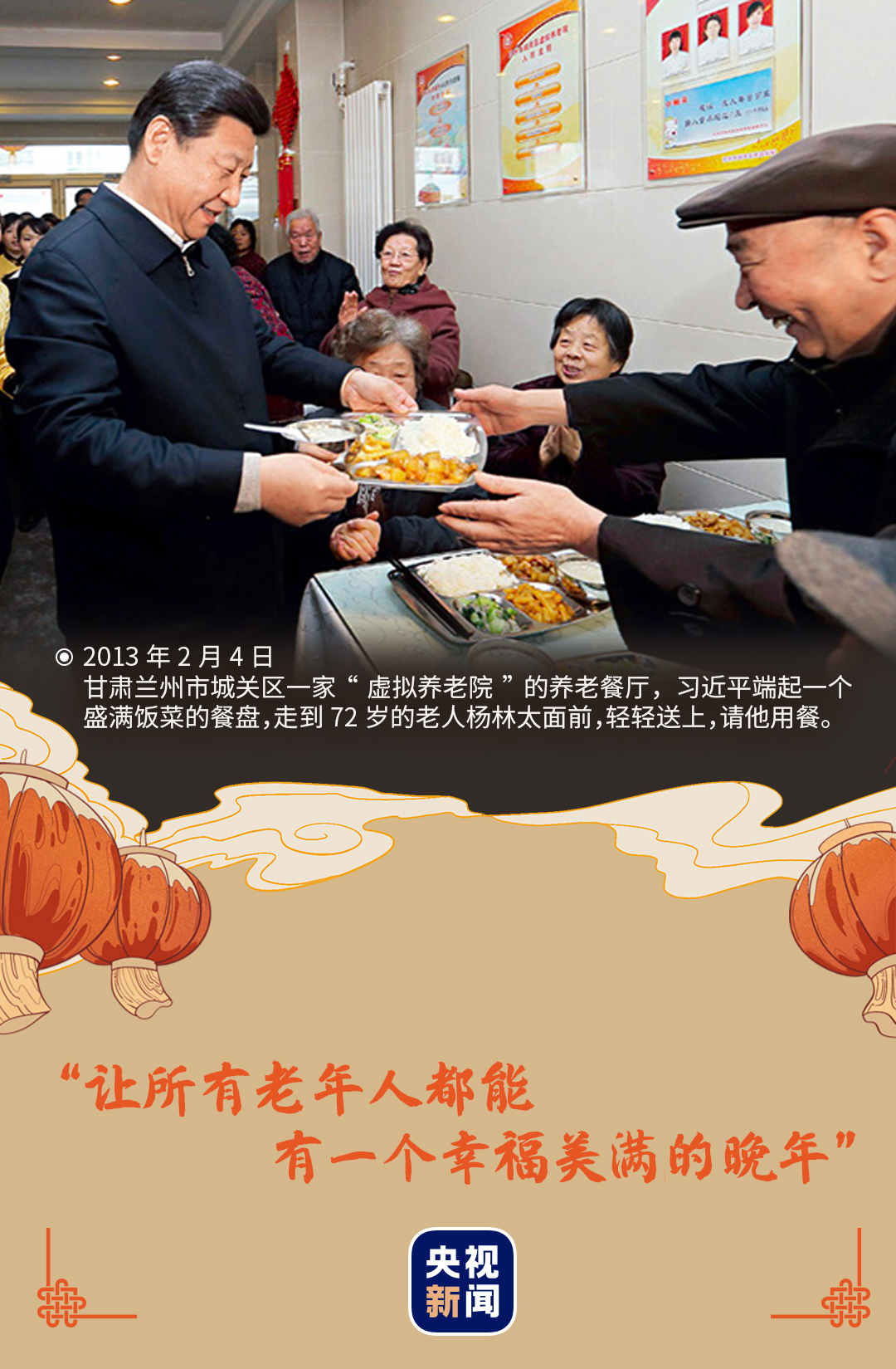 2013年春節(jié)前夕,習(xí)近平總書記來(lái)到城關(guān)區(qū)的一家“虛擬養(yǎng)老院”養(yǎng)老餐廳,詳細(xì)了解“虛擬養(yǎng)老院”的運(yùn)行情況,向老人們拜年。