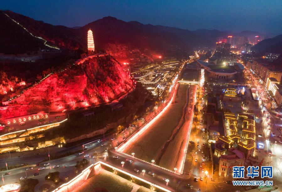 寶塔山下延安城區(qū)夜景(2月8日攝,無人機(jī)照片)。新華社記者 邵瑞 攝