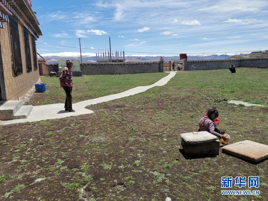 四川省甘孜藏族自治州理塘縣奔戈鄉(xiāng)卡灰村村民洛登(左一)在家門口(2020年5月30日攝)。新華社記者 康錦謙 攝
