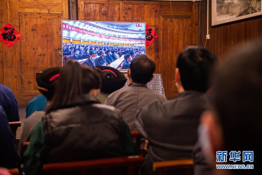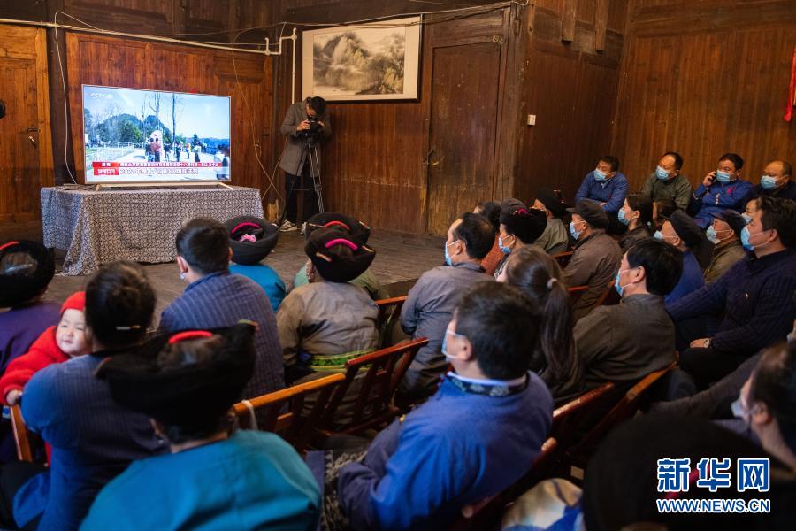 2月25日上午,在湖南省湘西土家族苗族自治州花垣縣十八洞村,當(dāng)?shù)馗刹?、群眾在一戶村民家收看全國脫貧攻堅總結(jié)表彰大會直播,電視畫面中正在介紹十八洞村。新華社記者 陳思汗 攝