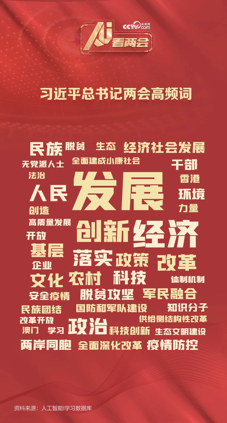 呈現(xiàn)在眼前的詞云圖中,“發(fā)展”“經(jīng)濟”“創(chuàng)新”“改革”“人民”“脫貧攻堅”等詞語引人注目,直接反映了習(xí)近平總書記歷年兩會的關(guān)注點。