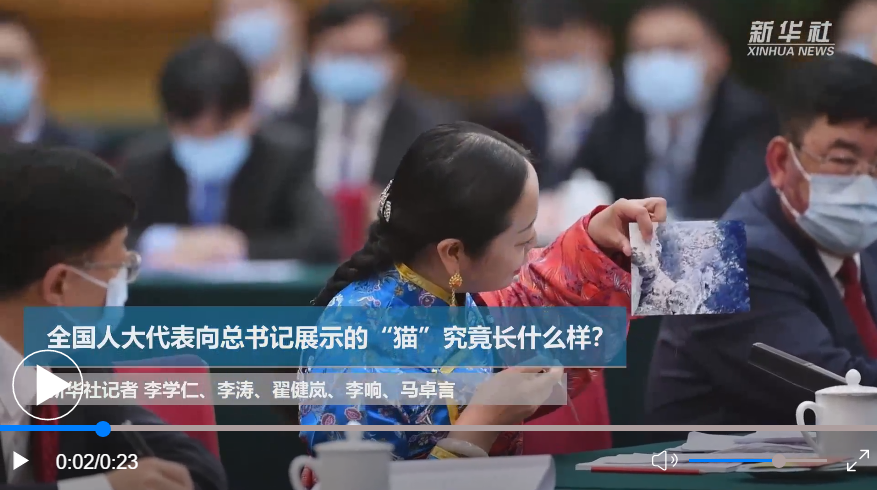 在會(huì)議現(xiàn)場(chǎng),全國(guó)人大代表、青海省海北藏族自治州門(mén)源回族自治縣教育局教研室副主任孔慶菊拿出兩張照片,向習(xí)總書(shū)記展示了兩種可愛(ài)的“貓”。
