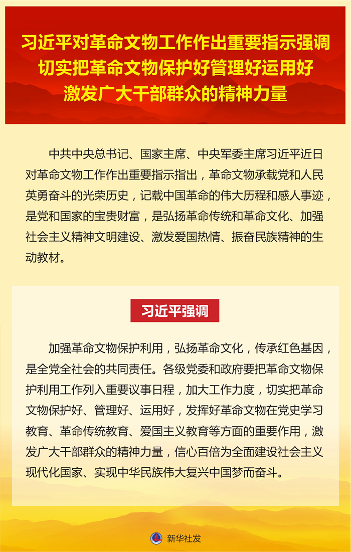 習近平強調(diào),加強革命文物保護利用,弘揚革命文化,傳承紅色基因,是全黨全社會的共同責任。各級黨委和政府要把革命文物保護利用工作列入重要議事日程,加大工作力度,切實把革命文物保護好、管理好、運用好,發(fā)揮好革命文物在黨史學習教育、革命傳統(tǒng)教育、愛國主義教育等方面的重要作用,激發(fā)廣大干部群眾的精神力量,信心百倍為全面建設社會主義現(xiàn)代化國家、實現(xiàn)中華民族偉大復興中國夢而奮斗。