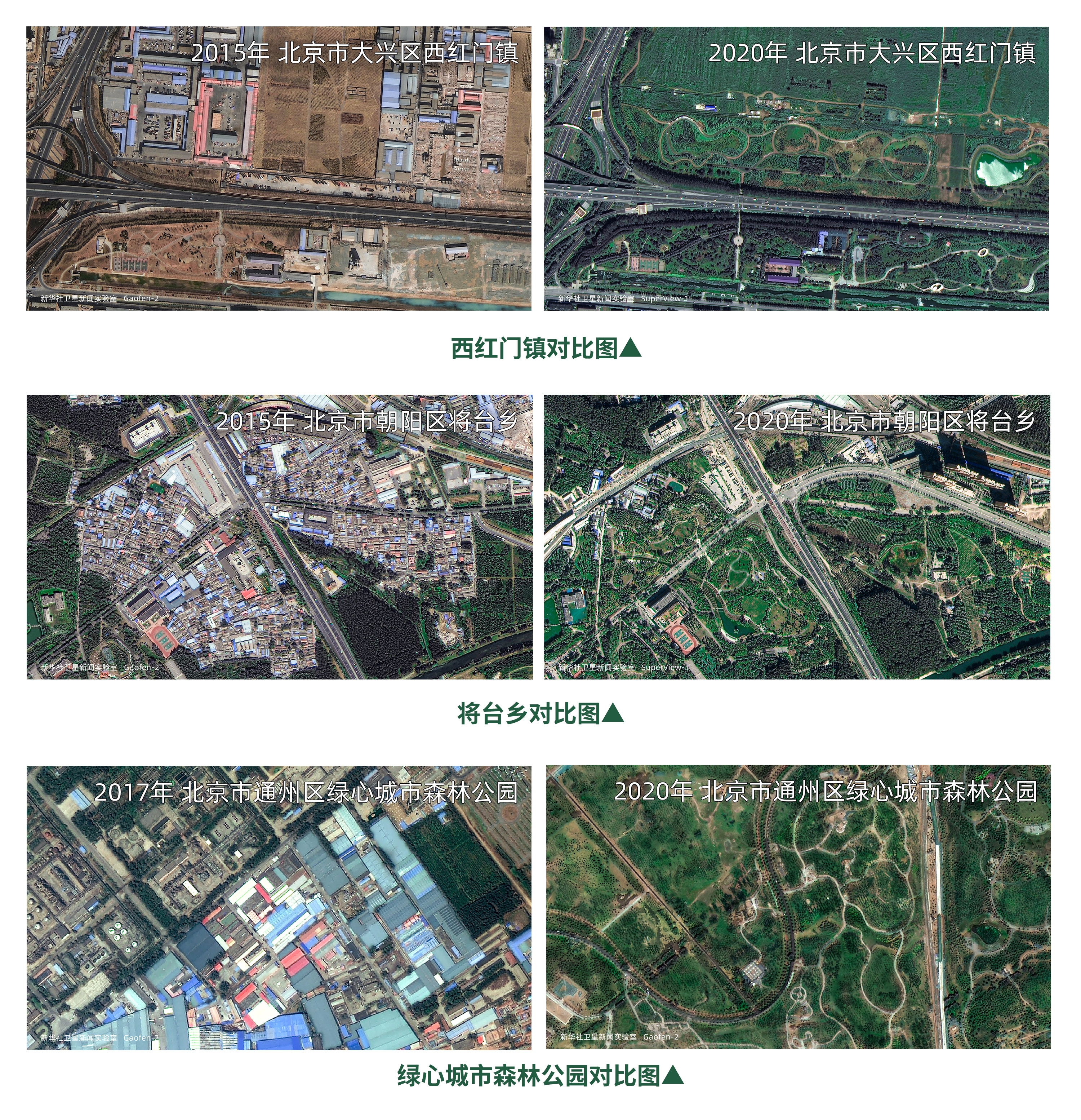 從太空觀測到,大興區(qū)西紅門鎮(zhèn)、朝陽區(qū)將臺鄉(xiāng)、通州區(qū)綠心城市森林公園發(fā)生了明顯變化。北京市通過規(guī)劃、改造等,遍插綠意描繪了城市“底色”。