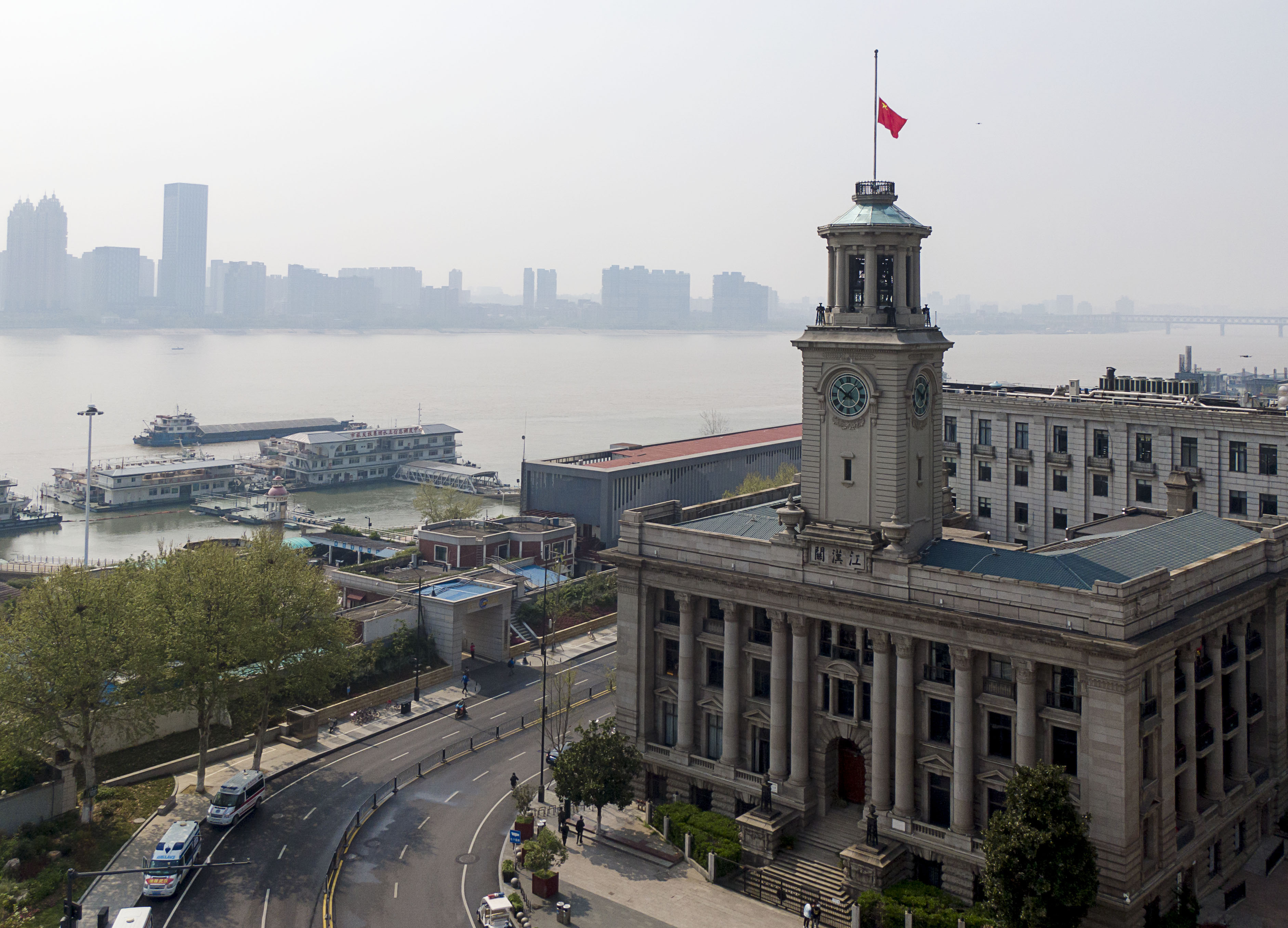 ↑2020年4月4日,武漢市舉行哀悼活動(dòng),表達(dá)對抗擊新冠肺炎疫情斗爭犧牲烈士和逝世同胞的深切哀悼。這是武漢江漢關(guān)大樓下半旗志哀。新華社記者 熊琦 攝