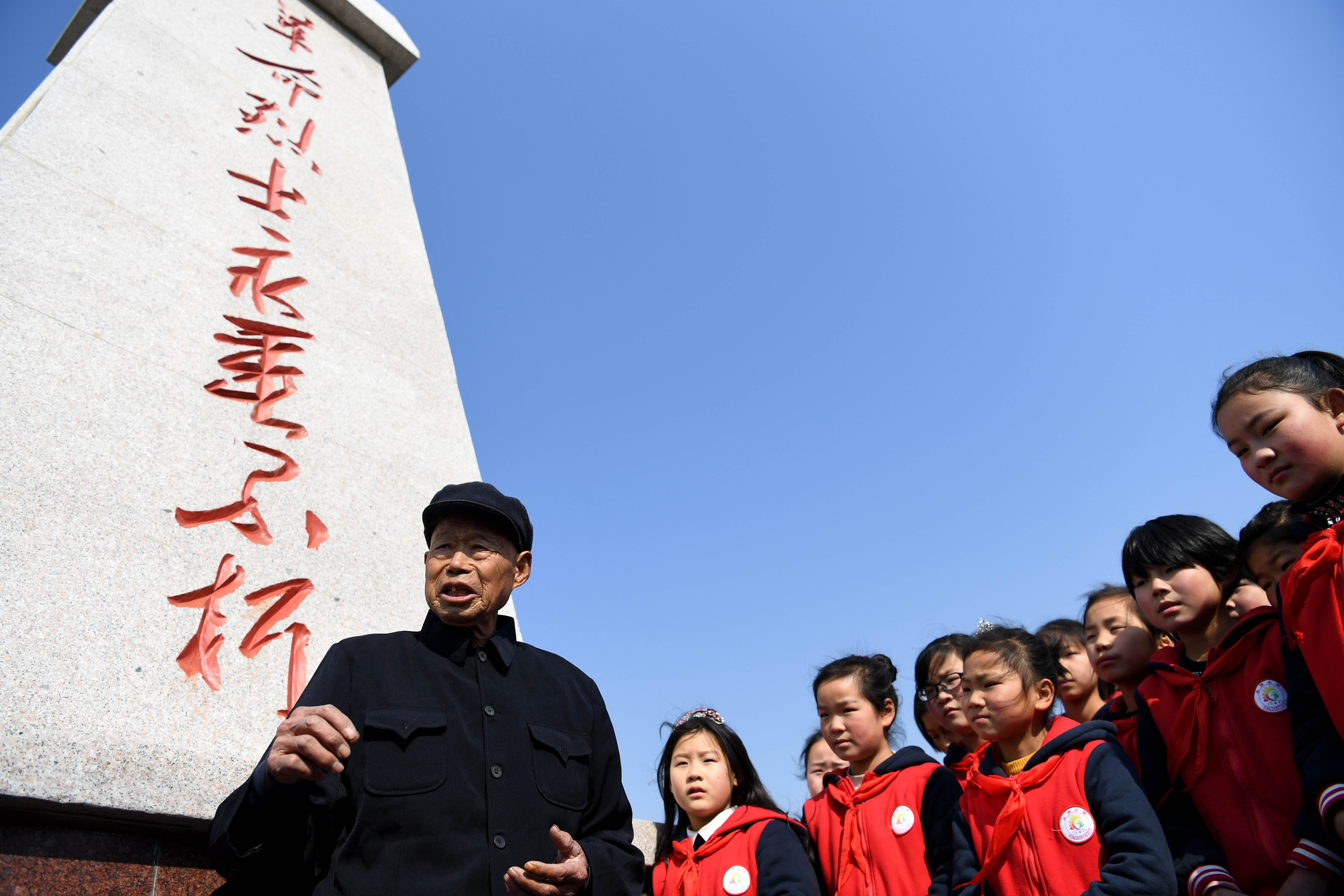 ↑今年89歲的胡兆倫是安徽省懷遠(yuǎn)縣陳集鎮(zhèn)胡劉烈士陵園管理員,70多年如一日為英烈們守墓。這是他在烈士陵園為前來掃墓的小學(xué)生講解烈士的事跡(2019年3月14日攝)。新華社記者劉軍喜攝