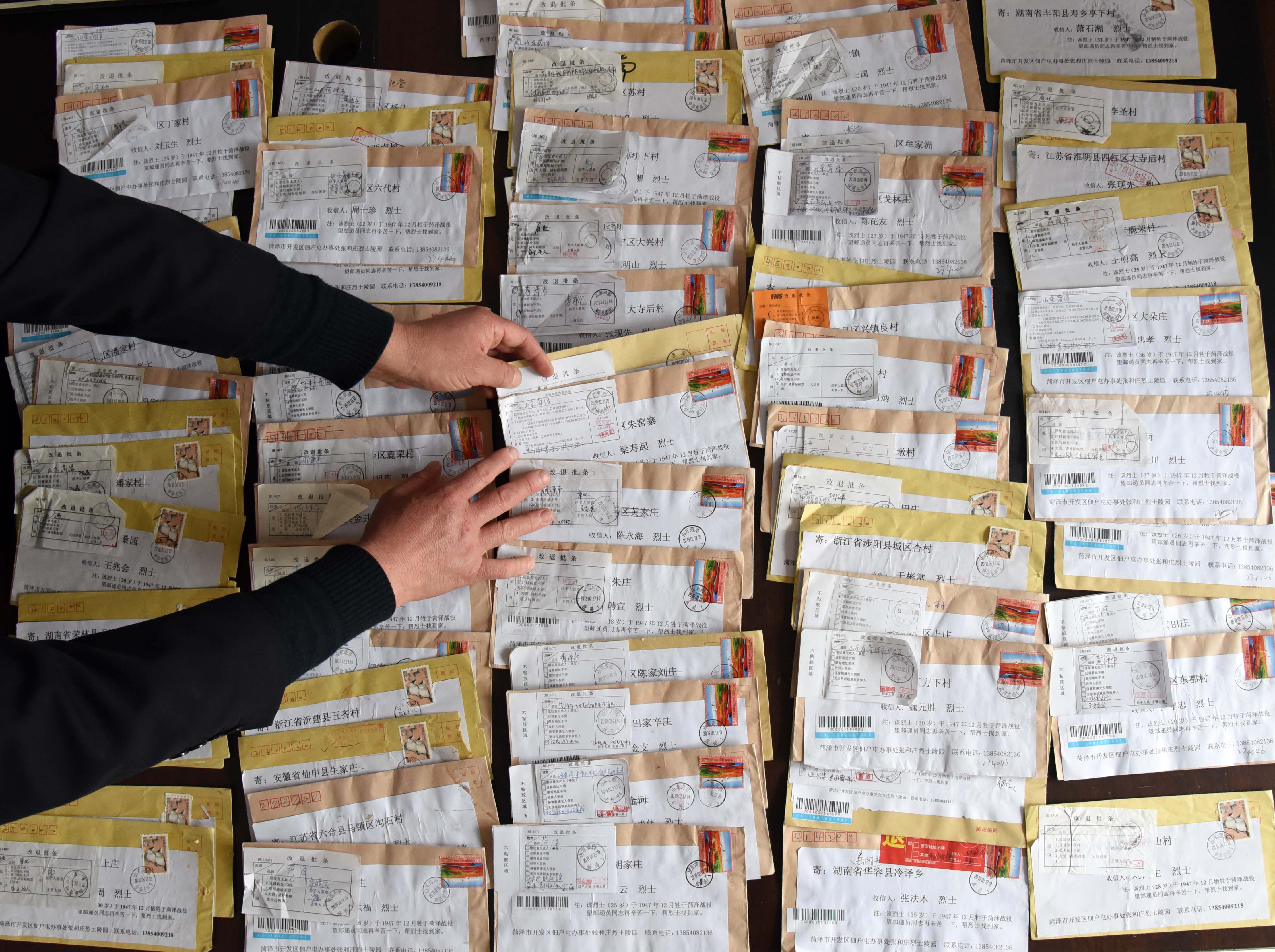↑2008年,時(shí)任山東省菏澤市張和莊村黨支部書記的張景憲決心為張和莊烈士陵園的無名烈士找到家鄉(xiāng)和親人,告慰他們的英靈。從2014年開始,張景憲按照先前尋訪到的資料地址,通過寄信等方式至今已為38位烈士找到親人。這是2019年3月20日,張景憲在整理多年來他收到的退信。新華社記者 王凱攝