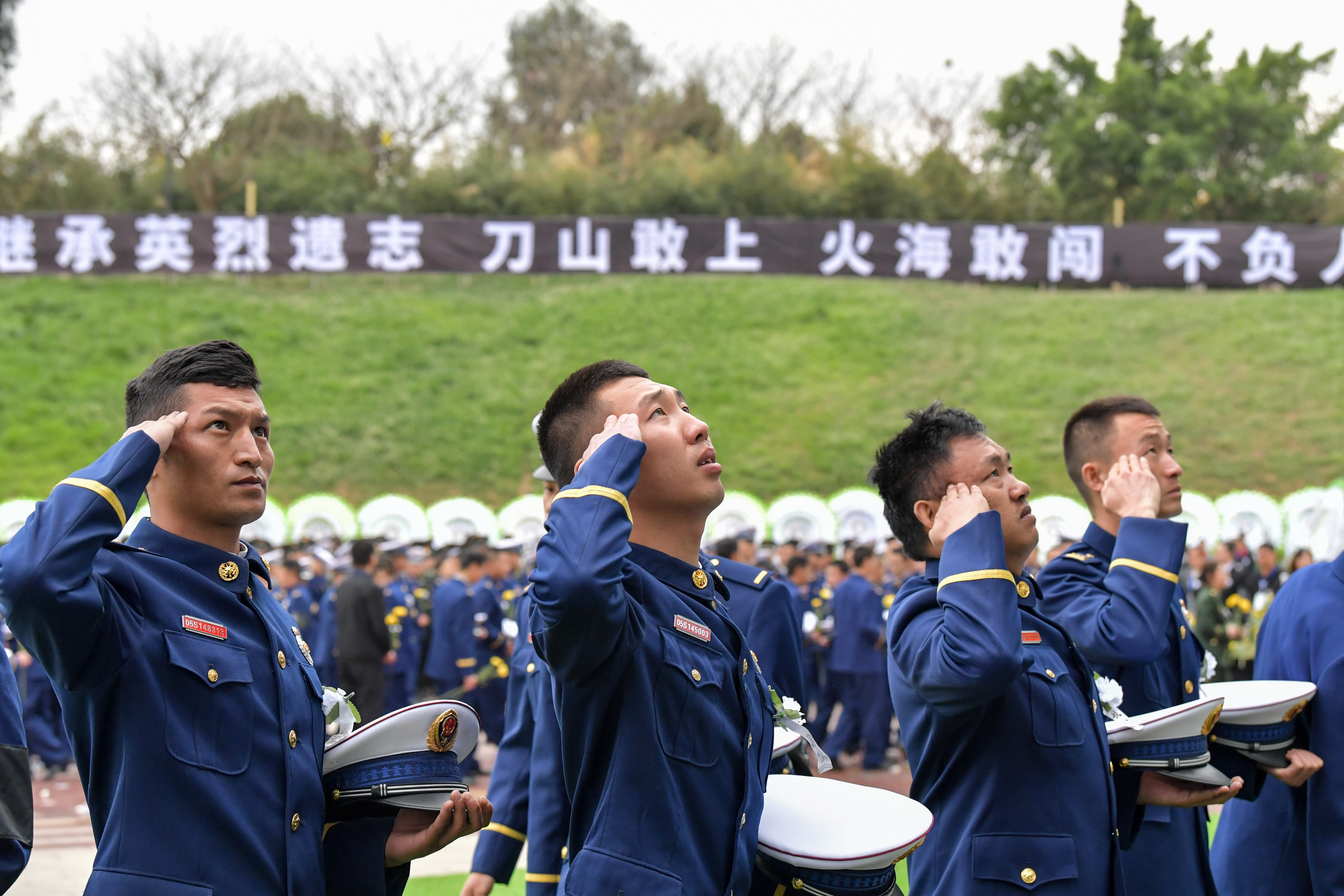 ↑2019年4月4日,參加四川木里森林火災(zāi)撲救中英勇犧牲烈士悼念活動(dòng)的森林消防官兵向犧牲的戰(zhàn)友敬禮。在這場火災(zāi)中,共有27名森林消防隊(duì)員犧牲。新華社記者 張超群 攝