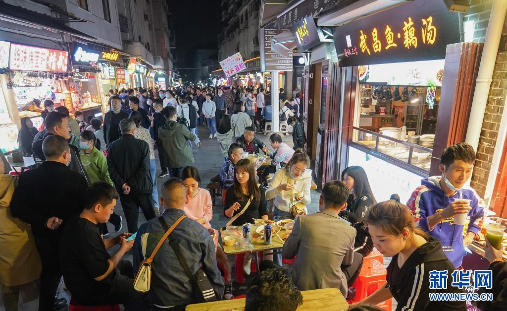 3月28日,人們?cè)谖錆h市著名的小吃街戶部巷休閑消費(fèi)。新華社記者 程敏 攝