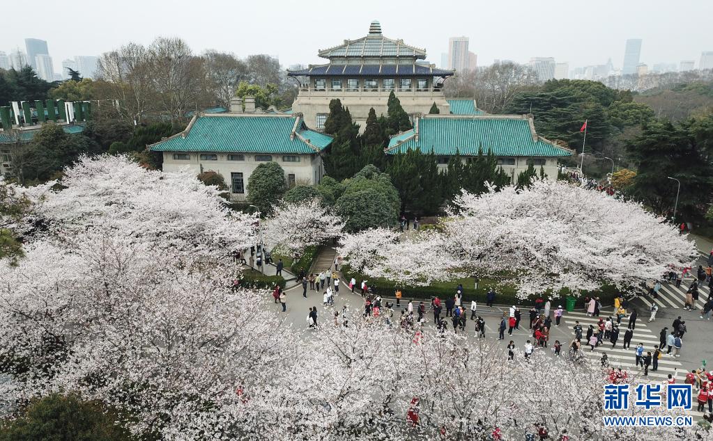 3月13日,武漢大學(xué)抗疫醫(yī)護(hù)人員賞櫻專場(chǎng)啟動(dòng),來自全國(guó)各地的援鄂抗疫英雄在櫻花樹下重逢,盡享櫻花之約(無人機(jī)照片)。新華社記者 程敏 攝