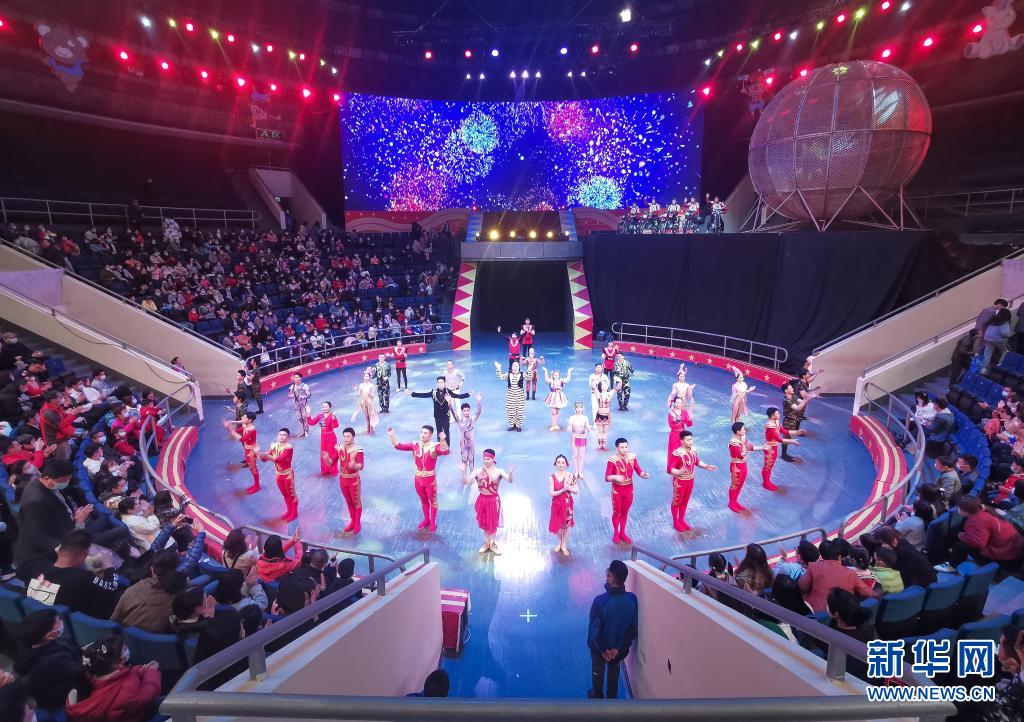 4月3日,武漢雜技廳的演員們?cè)谘莩龊笙蛴^眾謝幕。新華社記者 肖藝九 攝