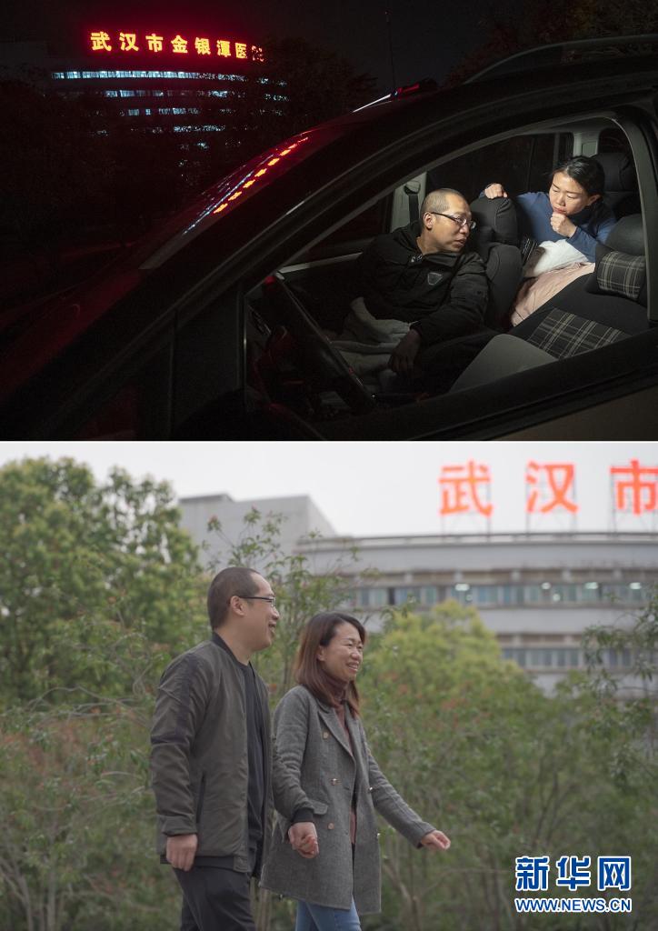 這是一張拼版照片,上圖為:2020年2月22日晚,武漢市金銀潭醫(yī)院的醫(yī)護(hù)夫妻涂盛錦(左)與曹珊在車內(nèi)聊天。從大年初一開始,兩人就住進(jìn)車?yán)?,為在疫情中搶救病患,?zhēng)分奪秒,以車為家;下圖為:3月23日,武漢市金銀潭醫(yī)院的醫(yī)護(hù)夫妻涂盛錦和曹珊在下班路上。新華社記者 熊琦 攝