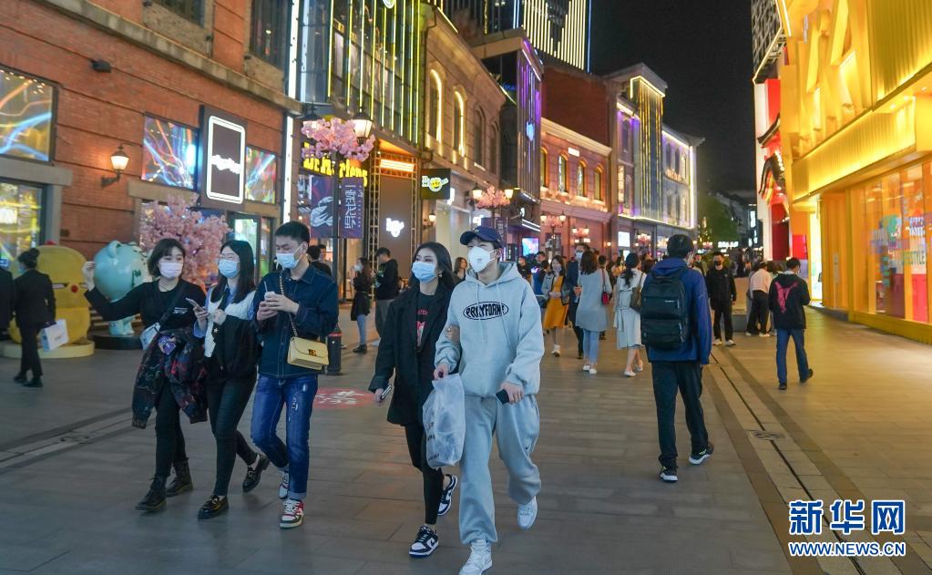 3月28日,人們?cè)谖錆h市楚河漢街游玩。新華社記者 程敏 攝