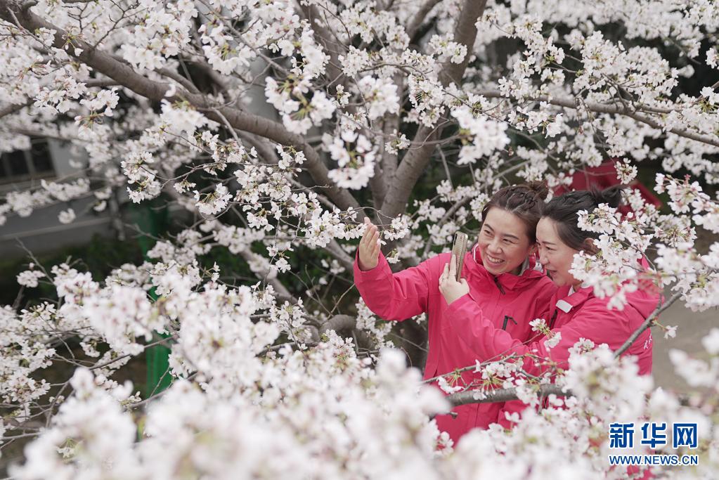 3月13日,武漢雷神山醫(yī)院醫(yī)護(hù)人員在櫻花樹下賞花。當(dāng)日,武漢大學(xué)抗疫醫(yī)護(hù)人員賞櫻專場(chǎng)啟動(dòng),來自全國(guó)各地的援鄂抗疫英雄在櫻花樹下重逢,盡享櫻花之約。新華社記者 熊琦 攝