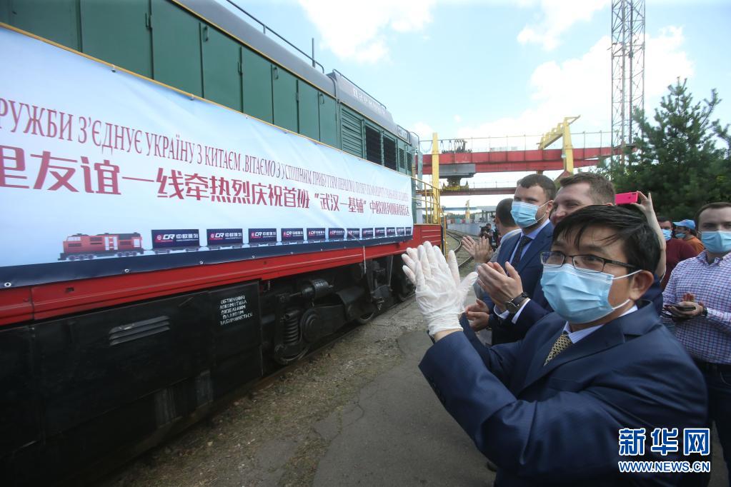 2020年7月6日,在烏克蘭首都基輔市利斯基貨運(yùn)站,中烏兩國(guó)代表迎接“武漢—基輔”中歐班列。該班列是中國(guó)華中地區(qū)首列直達(dá)烏克蘭的中歐班列。新華社發(fā)(謝爾蓋·斯塔拉斯堅(jiān)科攝)