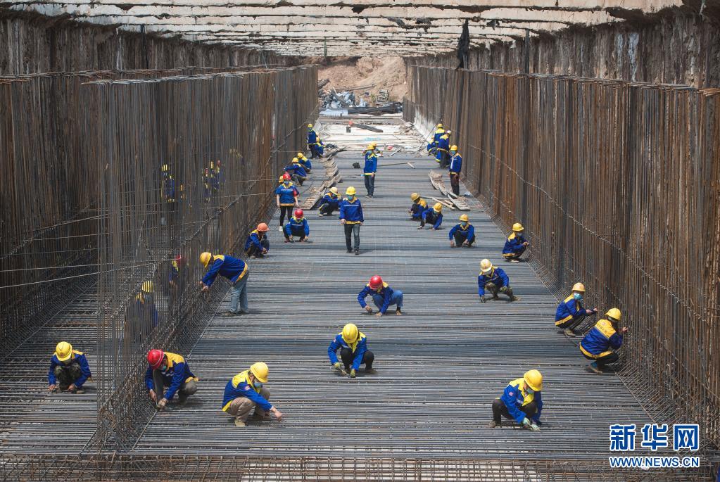 2020年4月30日,來自中鐵七局的建設(shè)者在武漢武九北綜合管廊工程施工現(xiàn)場(chǎng)作業(yè)。新華社記者 肖藝九 攝