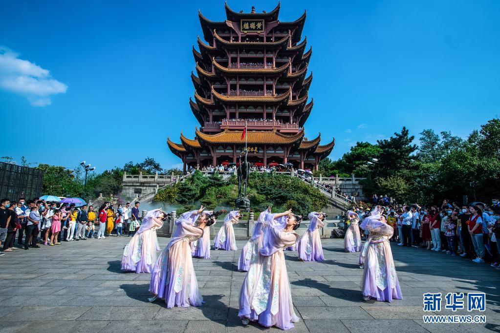 2020年10月1日,游客在武漢黃鶴樓景區(qū)觀看演出。新華社記者 肖藝九 攝