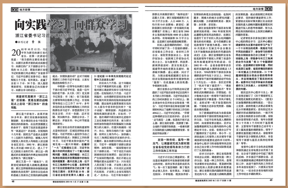 2003年3月,第10期、第11期《瞭望》連續(xù)刊發(fā)費(fèi)強(qiáng)采寫(xiě)的深度報(bào)道《浙江省委書(shū)記習(xí)近平:雙輪驅(qū)動(dòng)提速發(fā)展》《向?qū)嵺`學(xué)習(xí) 向群眾學(xué)習(xí)——浙江省委書(shū)記習(xí)近平調(diào)研紀(jì)實(shí)》。4個(gè)月后,浙江省委十一屆四次全會(huì)提出了面向未來(lái)要進(jìn)一步發(fā)揮八個(gè)方面的優(yōu)勢(shì)、推進(jìn)八個(gè)方面的舉措,即“八八戰(zhàn)略”。其中的諸多提法,在《瞭望》的上述報(bào)道中已現(xiàn)雛形。