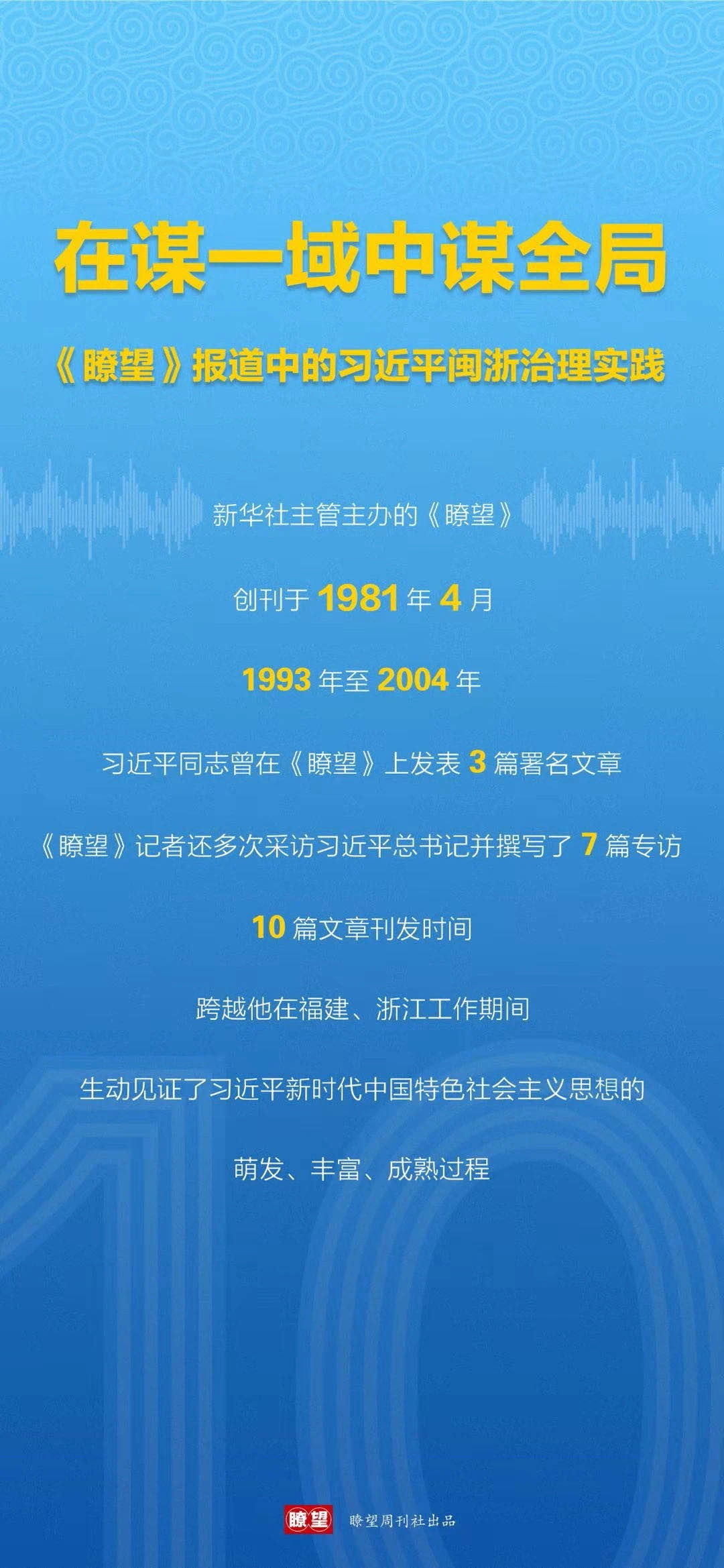 新華社主管主辦、創(chuàng)刊于1981年4月的《瞭望》,從1993年至2004年,曾先后10次專(zhuān)訪習(xí)近平同志或刊發(fā)他的署名文章,時(shí)間跨越他在福建、浙江工作期間,生動(dòng)見(jiàn)證了習(xí)近平新時(shí)代中國(guó)特色社會(huì)主義思想的萌發(fā)、豐富、成熟過(guò)程。
