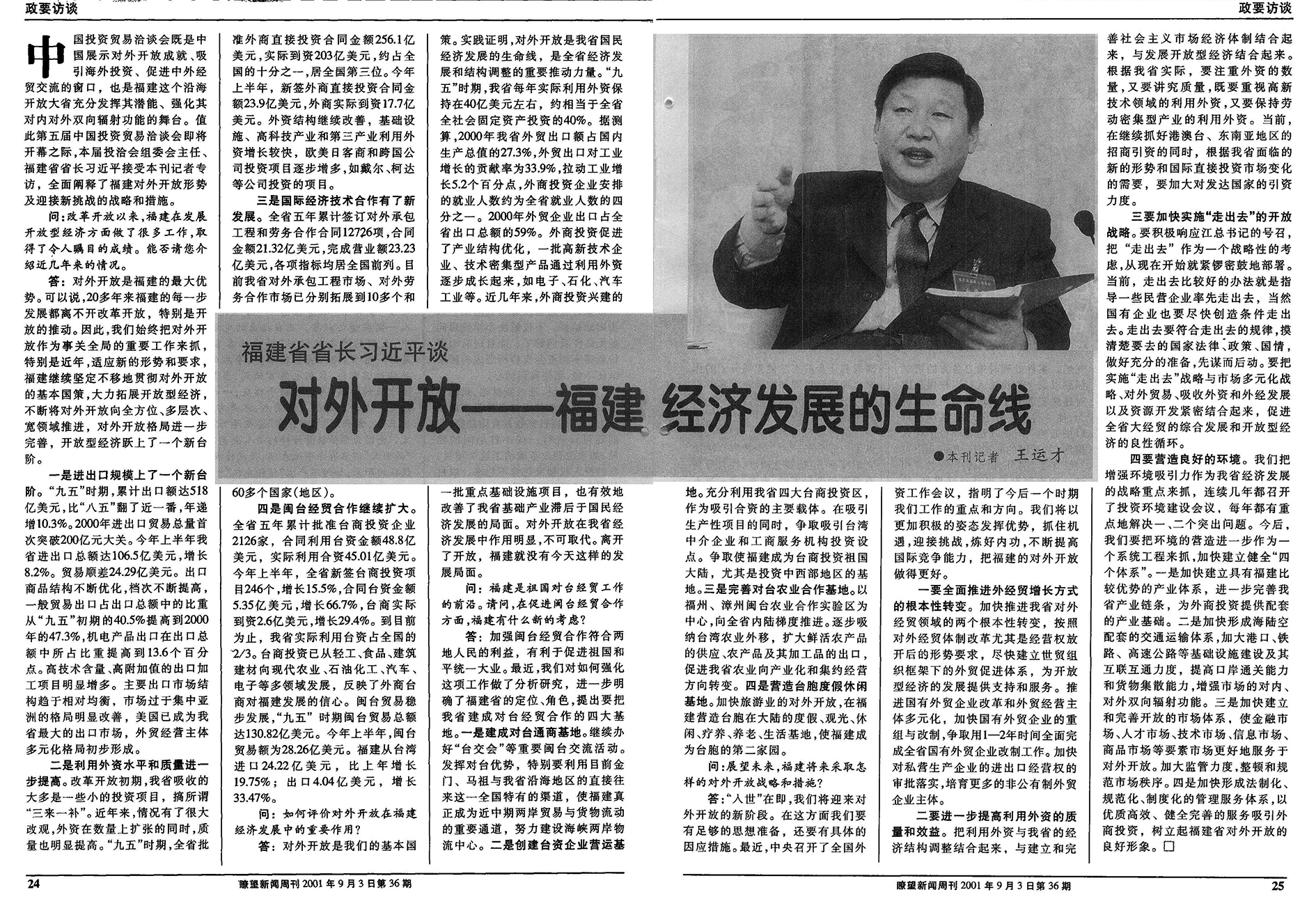 2001年9月3日,《瞭望》再次刊發(fā)專(zhuān)訪報(bào)道《福建省省長(zhǎng)習(xí)近平談:對(duì)外開(kāi)放——福建經(jīng)濟(jì)發(fā)展的生命線》。
