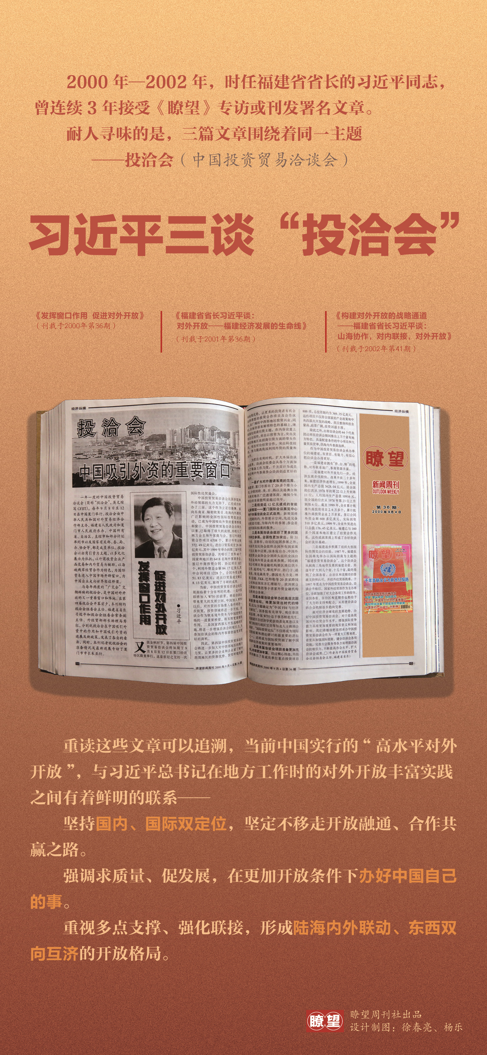 2000~2002年連續(xù)三年,讀者都能在《瞭望》上看到習(xí)近平的署名文章或?qū)TL報(bào)道。耐人尋味的是,三篇稿件圍繞著同一個(gè)主題:投洽會(huì)。
