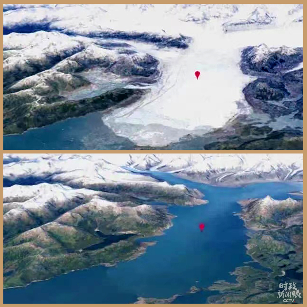 △阿拉斯加,哥倫比亞冰川(上圖為1984年,下圖為2020年)。哥倫比亞冰川是世界上變化最快的冰川之一,通過照片能清晰看到氣候變暖導(dǎo)致冰川不斷消退。(資料圖)