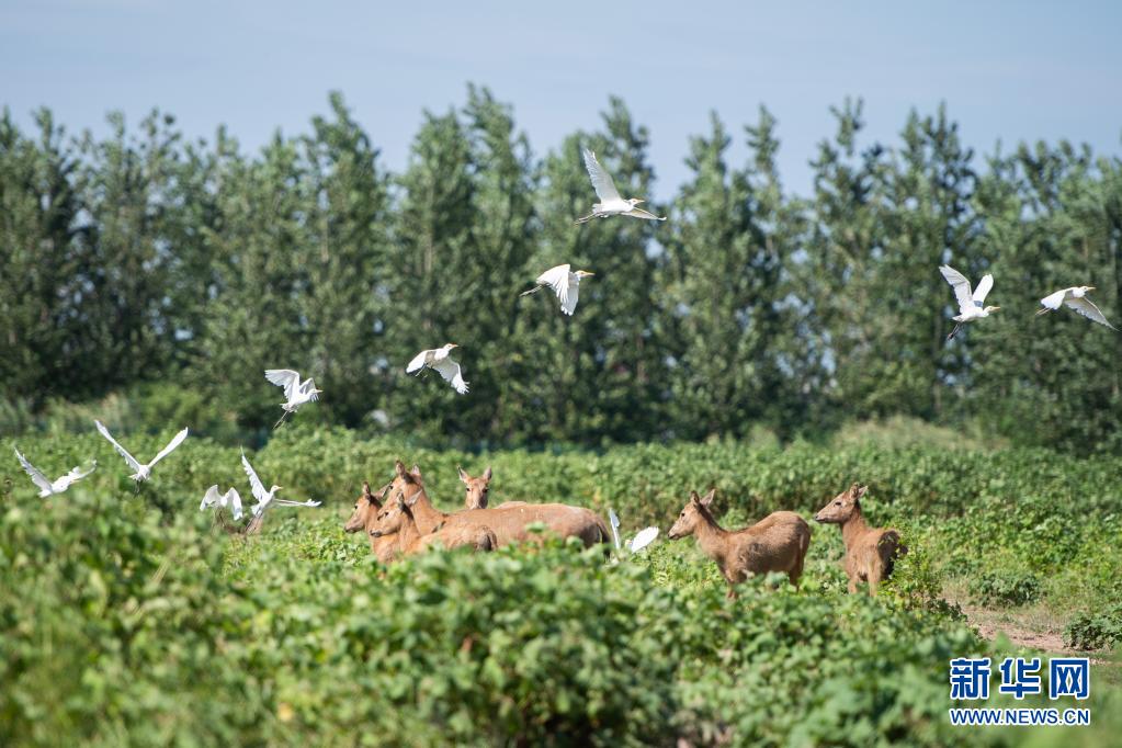 這是在湖南岳陽(yáng)東洞庭湖麋鹿和鳥(niǎo)類救治避難中心拍攝的麋鹿和飛鳥(niǎo)(2020年8月7日攝)。新華社記者 陳思汗 攝